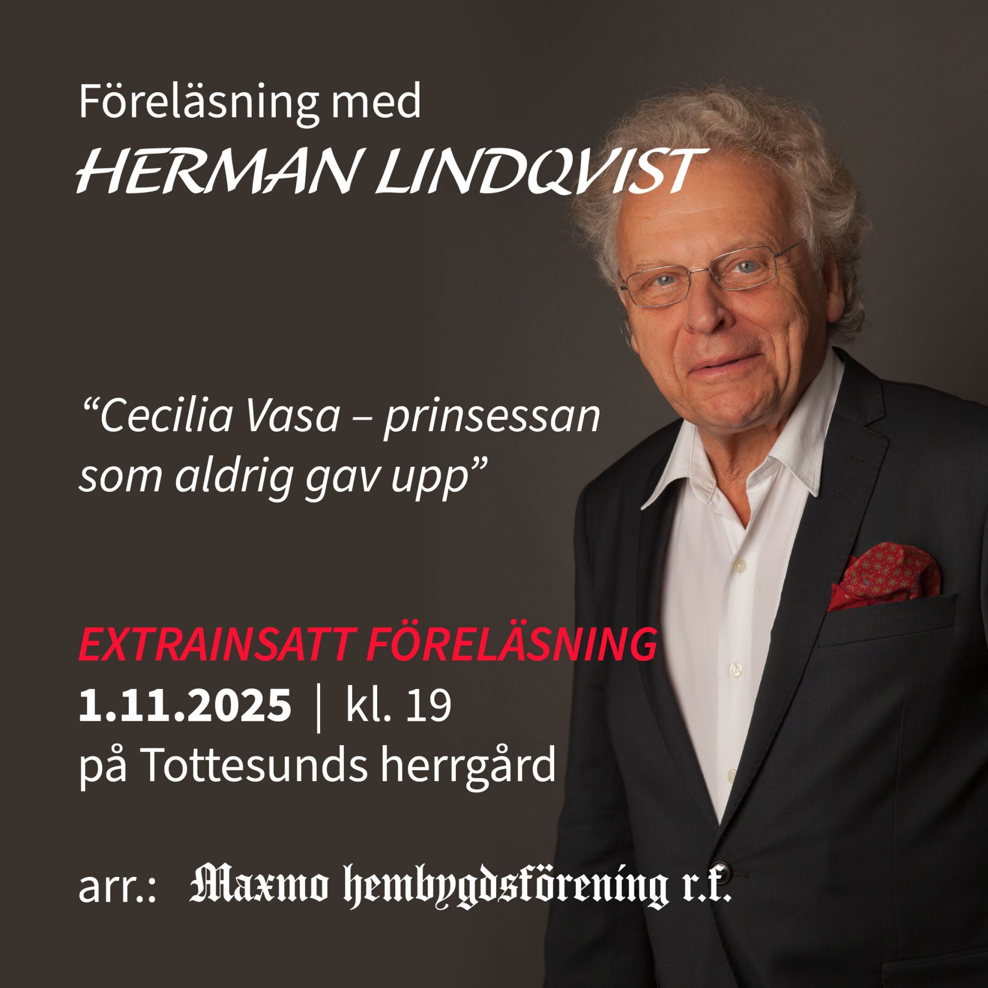 Föreläsningen på fredag är slutsåld men vi har satt in en extra föreläsning på lördag samma tid.